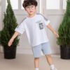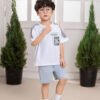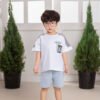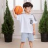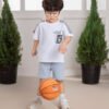 - Kiểu dáng : Áo thun bé trai , dáng rộng cơ bản điểm nhấn là mảng pha phối 2 bên vai kết hợp cùng hình in rằn ri đầy mới mẻ và khoẻ khoắn