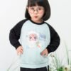 Áo dáng suông, tay dài phối raglan với phần tay áo màu đen tương phản tạo điểm nhấn.