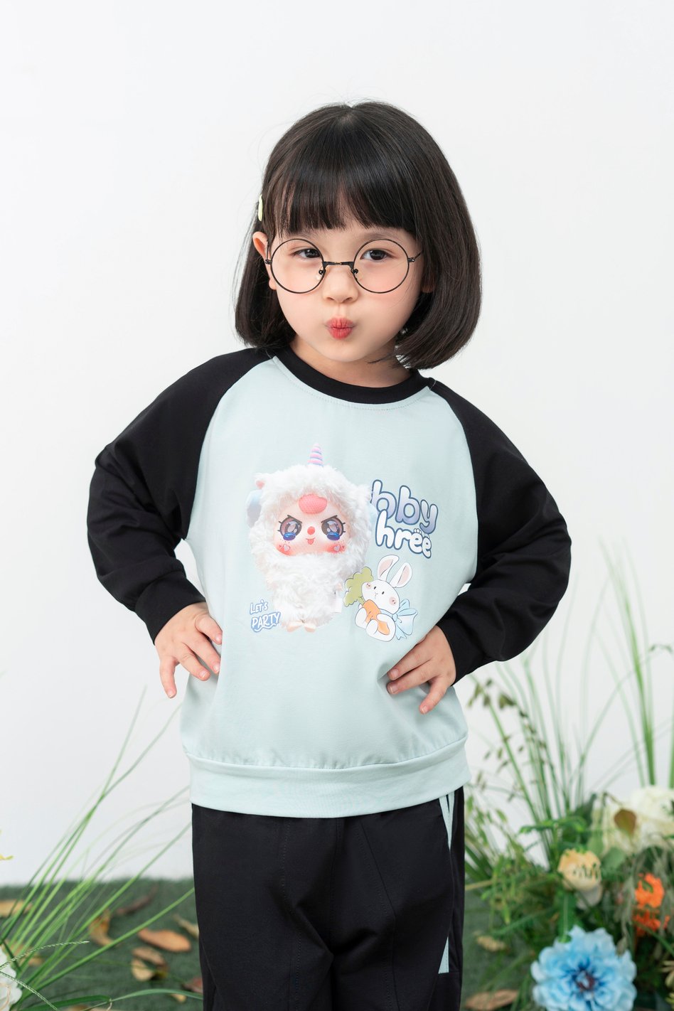 Thân áo có ba tông màu nổi bật: hồng pastel, tím nhạt và xanh mint, in hình thú cưng hoạt hình “bbaby three” dễ thương, sinh động.